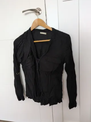 Camisa negra de manga larga con un diseño arrugado y detalles únicos. - Cuello camisero. - Cierre de botones. - Bolsillos en el pecho. - Detalle de anilla en los puños.