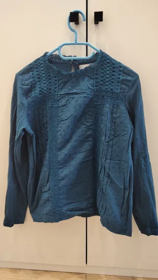 Camiseta de manga larga con un bonito diseño. - Color verde azulado. - Detalle de encaje en el cuello y mangas. - Tejido con pequeños topos. - Diseño con pliegues y puntillas. - Botón en la parte trasera.