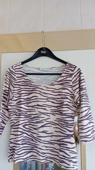 Camiseta con estampado de cebra en tonos beige y marrón. Presenta mangas francesas. - Diseño de cebra. - Mangas de tres cuartos. - 47 cm largo* 36 cm ancho. Es elástica.