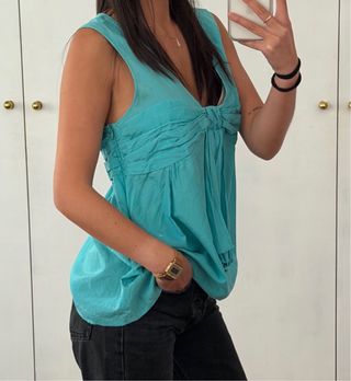 Blusa sin mangas de color azul turquesa - Diseño con lazada frontal. - Cuello pico - Cremallera lateral - Tejido ligero y fluido. - Pone talla L, yo uso la S y me gusta como me queda, pero ideal para talla M