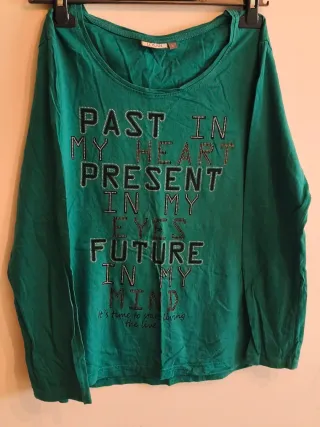Camiseta de manga larga con un diseño de texto llamativo. La frase PAST IN MY HEART, PRESENT IN MY EYES, FUTURE IN MY MIND está adornada con detalles brillantes. - Diseño de texto con pedrería. - Cuello redondo. - Manga larga.
