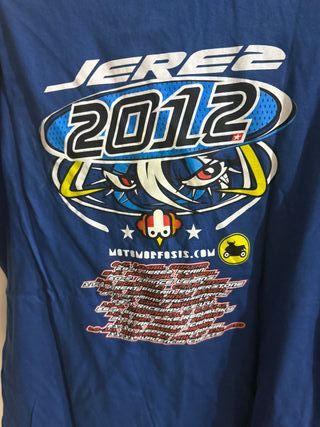 Camiseta de manga corta conmemorativa del evento MotoGP de Jerez en 2012. Presenta un diseño vibrante con motocicletas en plena carrera y el texto Spain's N°1. - Diseño frontal con gráficos de MotoGP. - Estampado Jerez 2012 y Spain's N°1.