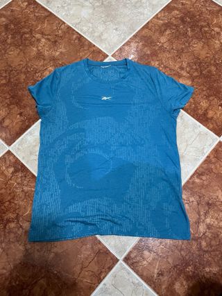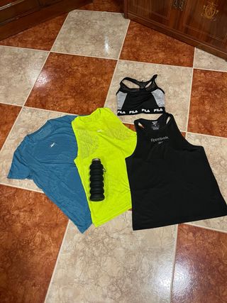 Conjunto de prendas deportivas para entrenar. - Camiseta sin mangas negra de Reebok. - Camiseta sin mangas verde neón de Reebok. - Camiseta de manga corta azul de Reebok. - Sujetador deportivo negro y gris Fila. Muy usado, los desperfectos los puedes ver en las fotos. - Botella de agua plegable negra. Sin estrenar