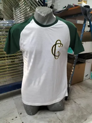 Camiseta de manga corta con diseño raglán. - Cuerpo blanco. - Mangas y cuello verde. - Logo en el pecho,imitando las letras del real Betis balompié. -Logo pequeño en la parte de la nuca