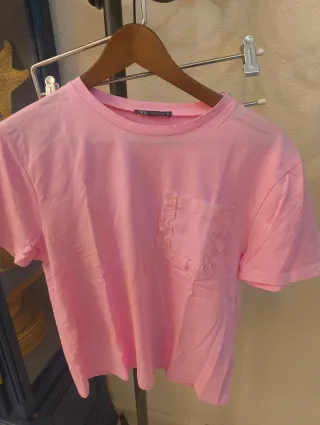 Camiseta de manga corta con bolsillo. - Diseño con detalle de volantes en el bolsillo. - Cuello redondo.