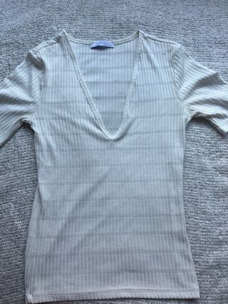 Top de Zara en color blanco, con un diseño de canalé y manga corta. - Escote en pico pronunciado. - Tejido elástico acanalado. - Corte ajustado al cuerpo.