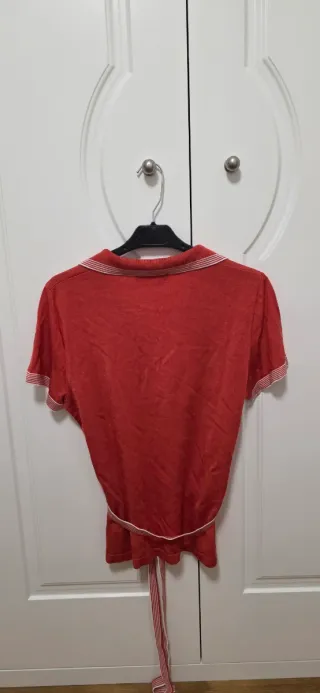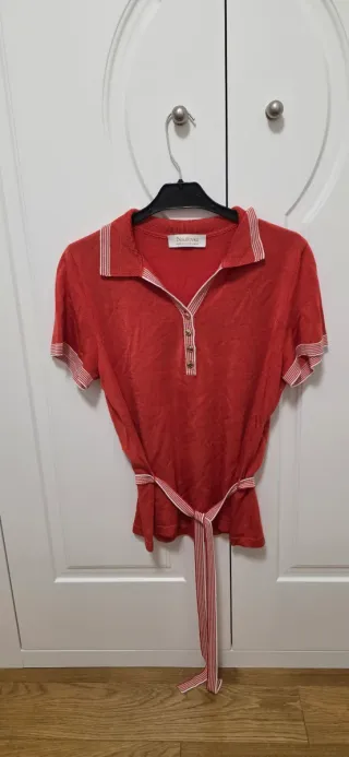 Camiseta de manga corta con cuello polo y cinturón a juego. - Diseño con detalles a rayas en cuello y mangas. - Cierre de botones en la parte delantera. - Cinturón de tela a juego para anudar a la cintura.