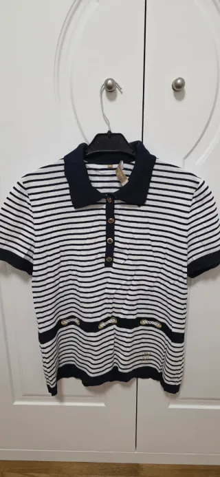 Camiseta de manga corta con cuello polo y estampado de rayas. Presenta detalles marineros en la parte inferior. - Cuello y puños en contraste. - Cierre de botones dorados. - Detalle de cordones y logo en la cintura.