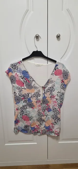 Camiseta Naf Naf con un estampado floral vibrante y alegre. - Diseño de manga corta. - Cuello en V con detalle de cremallera. - Bajo con acabado festoneado.