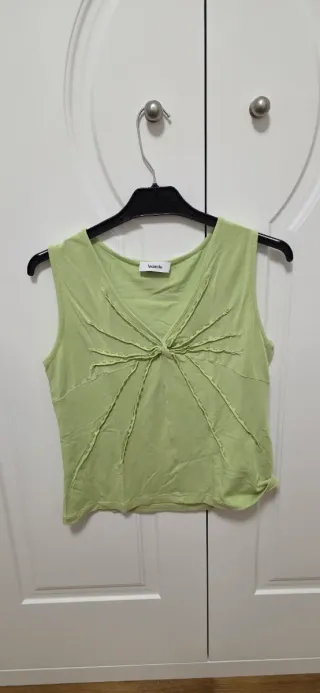 Camiseta sin mangas con un diseño único y moderno. - Cuello en V con detalle de nudo. - Costuras decorativas que crean un patrón radial. - Tejido suave y ligero.