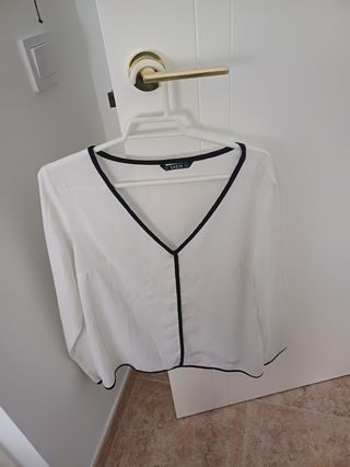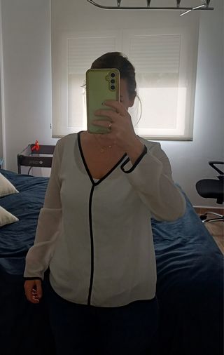 Elegante blusa de SHEIN con un diseño moderno y detalles que la hacen destacar. - Cuello en V con ribete negro. - Manga larga. - Tejido ligero y fluido.