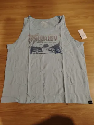 Camiseta sin mangas de la marca Hurley con un diseño gráfico inspirado en la playa. - Estampado frontal con palmeras y paisaje marino. - Logo de Hurley en la parte inferior trasera.