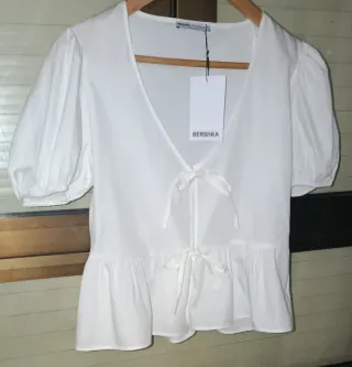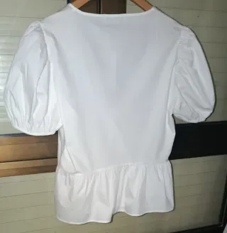 Camisa de manga corta con un diseño moderno y favorecedor. - Escote pronunciado en V. - Cierre con lazada. - Peplum en la cintura. - Mangas abullonadas.