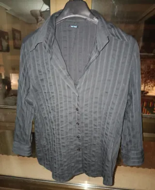 Elegante camisa negra con un diseño de rayas verticales sutiles que añaden textura. El cuello es de solapa y tiene cierre de botones. - Diseño de rayas verticales. - Mangas de tres cuartos. - Cierre frontal de botones.