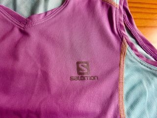 Camiseta deportiva sin mangas de la marca Salomon, con un diseño bicolor. - Paneles laterales en color azul claro. - Panel central en color rosa. - Costuras decorativas en tono melocotón. - Súper ligera y transpirable. - Muy poco uso sin posibilidad de devolver.