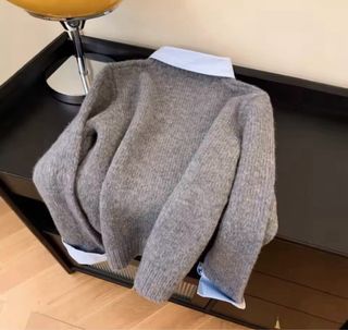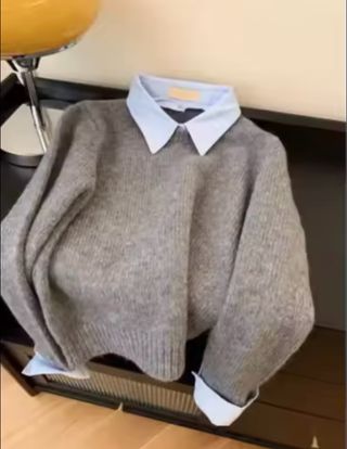 Jersey de punto gris con un diseño de superposición de camisa azul. Ideal para un look casual y elegante. - Cuello de camisa de popelina. - Puños de camisa visibles.