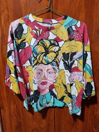 Camiseta de Zara con un diseño vibrante y artístico. Perfecta para añadir un toque de color a tu armario. - Estampado multicolor con motivos florales y un retrato. - Manga corta ancha. - Cuello redondo.