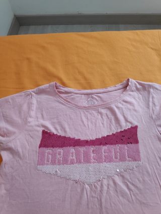 Camiseta Estampada con Lentejuelas de TEX. Manga Corta, cuello Redondo Acanalado, bajo Acanalado Corte Recto. Diseño Estampado con lentejuelas rojas, rosas y blancas con motivo "GRATEFUL" ("agradecida" en inglés). -Marca: TEX. -Composicion: Algodón. -Color: Rosa//Varios. -Talla: S. -Estado: Muy Bueno. Prácticamente Nueva.