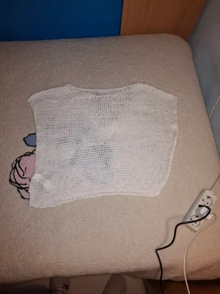 Top blanco de manga larga con un detalle de cadena en la parte inferior. - Diseño crop top. - Manga larga. - Detalle de cadena metálica. Es talla XS. Tiene poco uso, está en perfecto estado.