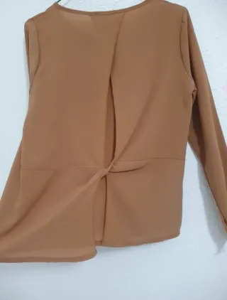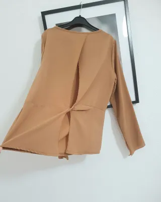 Blusa de manga larga. - Abertura en la espalda con detalle de nudo. - Corte holgado y favorecedor. - Tejido suave y ligero. #boyi #comonuevo #blusa #talla38 #38 #marrón #beige #top #ropa #mujer