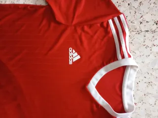 Camiseta deportiva Adidas en color rojo, patrocinado Aeroready. Logo bordado y camiseta original - Diseño con cuello redondo. - Bandas laterales características de la marca. - Mangas cortas con ribete blanco. - Logo de Adidas en el pecho.