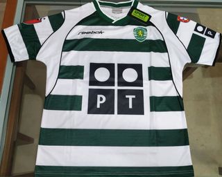 Camiseta de fútbol del Sporting CP con diseño a rayas verdes y blancas. Mítica camiseta del debut de Cristiano Ronaldo. - Logo de Reebok en el pecho. - Escudo del club en la manga. - Diseño frontal con cuadrados y letras.