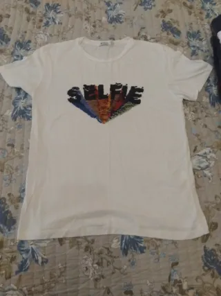 Camiseta blanca de manga corta con un diseño llamativo de lentejuelas. - Detalle de lentejuelas con la palabra SELFIE. - Diseño de lentejuelas en forma de V.