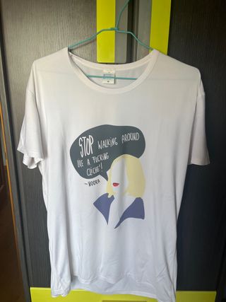 Camiseta blanca con estampado de la serie Friends. Diseño inspirado en una escena icónica de la serie. - Estampado frontal. - Cuello redondo. - Manga corta.