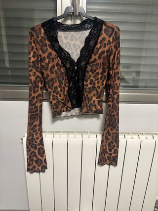 Camiseta con estampado de leopardo y detalles de encaje. - Manga larga acampanada. - Escote en V con encaje negro. - Tejido ligero y transparente. -Es una L, pero bastante pequeña