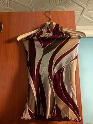Camiseta atada al cuello con un diseño de rayas onduladas en tonos marrones y morados. - Tejido ligero.
