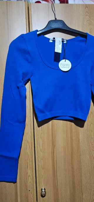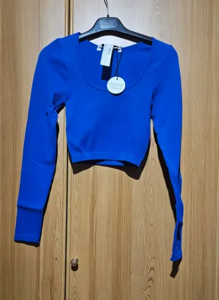 Camiseta de manga larga con un diseño moderno y cómodo. Su tejido acanalado le da un toque especial. - Cuello redondo. - Corte cropped.