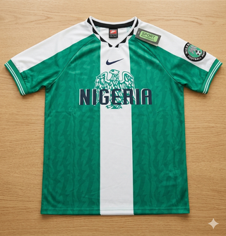 Camiseta de fútbol retro de Nigeria de la temporada 1996. - Diseño icónico con los colores verde y blanco. - Logo de Nike bordado. - Escudo de la Federación Nigeriana de Fútbol en la manga.