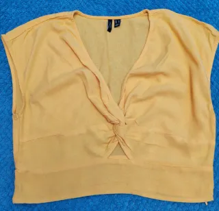 Blusa color mostaza con un lunares blancos de escote cruzado y fruncido en la cintura. Talla única, un uso. - Mangas cortas. - Cinturón para ajustar.