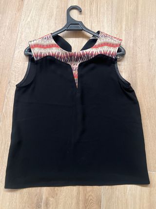 Camiseta elegante con un diseño llamativo en el cuello. - Sin mangas. - Cuello con estampado geométrico en tonos tierra y burdeos. - Corte recto.