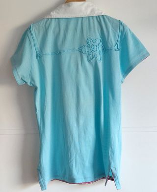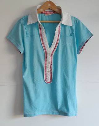 Camiseta de manga corta con cuello tipo polo y detalles a cuadros. - Cuello blanco. - Ribete a cuadros rojos y blancos. - Botones frontales. - Logo bordado en el pecho.