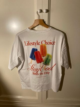Camiseta blanca con estampado gráfico. - Diseño moderno y llamativo. - Cuello redondo. - Manga corta.