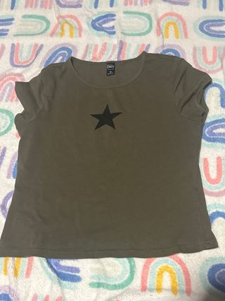 Camiseta de manga corta con un diseño moderno. La compre el año pasado en la etiqueta pone que es una XL pero en verdad es una M y es ajustada - Color verde militar. - Estampado de estrella negra en el centro. - Cuello redondo.