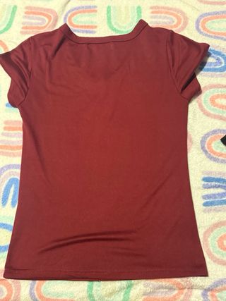 Camiseta de manga corta con un diseño moderno y llamativo. - Parte superior en color burdeos con estampado. - Parte inferior en color blanco. - Detalles en negro en las mangas. - Cuello redondo.