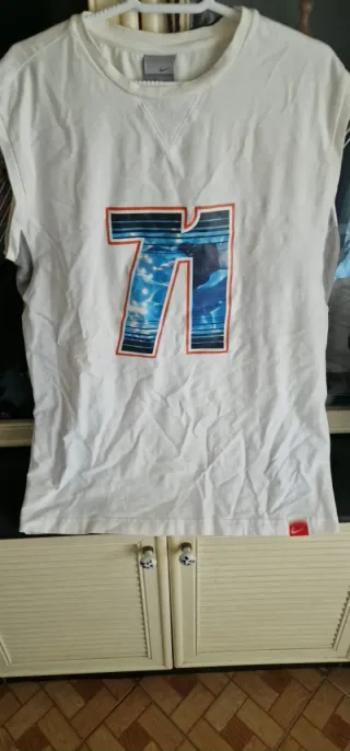 Camiseta blanca sin mangas de la marca Nike. - Diseño frontal con el número 71 y detalles gráficos. - Cuello redondo con costuras reforzadas. - Etiqueta de la marca visible en el cuello.