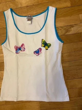 Camiseta sin mangas de Dolce & Gabbana con un diseño vibrante de mariposas. - Ribete azul en cuello y sisas. - Tres mariposas estampadas en la parte delantera.