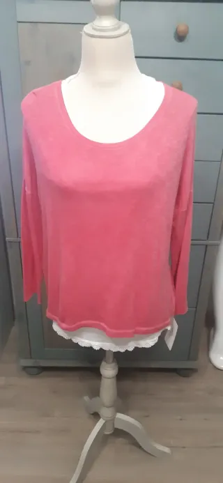 Camiseta de manga larga con un favorecedor escote redondo y un llamativo efecto doble. - Diseño de corte holgado. - Tejido suave y ligero. - Acabado con detalles de encaje en el bajo.