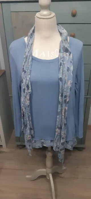 Camiseta azul que simula llevar debajo una blusa estampada Las mangas se pueden recoger y lleva foulard a juego