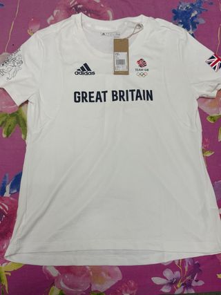 Camiseta deportiva blanca de Adidas para mujer, con diseño Team GB. - Logo de Adidas en el pecho. - Diseño Team GB con los anillos olímpicos. - Bandera del Reino Unido en la manga. - Estampado gráfico en la otra manga.