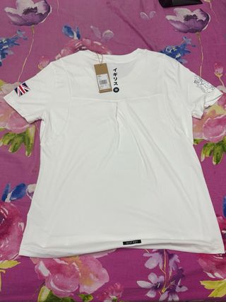 Camiseta de manga corta en color blanco con detalle de flores en marrón en la parte superior del pecho y mangas. Talla S de Springfield. Muy poco uso.