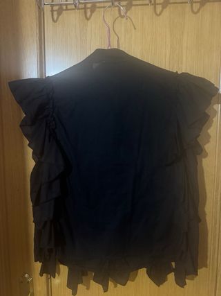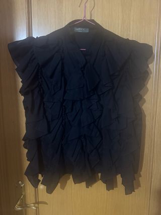 Elegante camisa con volantes y diseño sin mangas. - Marca: La Buck - Color: Negro - Detalle de volantes en cascada - Cuello camisero