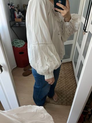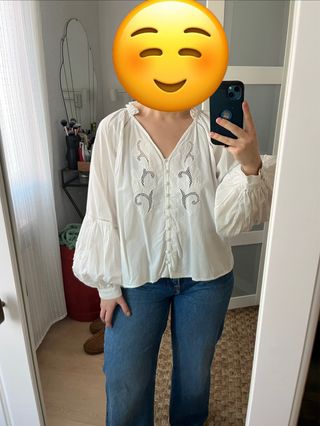 Blusa blanca con un diseño elegante y detalles únicos. - Mangas abullonadas. - Cuello con volantes. - Cierre de botones. - Bordados decorativos en la parte delantera.