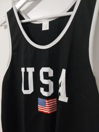 Camiseta sin mangas negra con diseño USA y la bandera estadounidense. - Diseño USA en blanco. - Bandera de Estados Unidos impresa. - Ribete blanco en cuello y sisas.