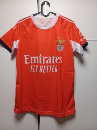 Camiseta deportiva del Benfica. - Diseño en color naranja. - Detalles blancos en mangas y cuello. - Logo del equipo en el pecho. - Inscripción 'Emirates Fly Better' en blanco.