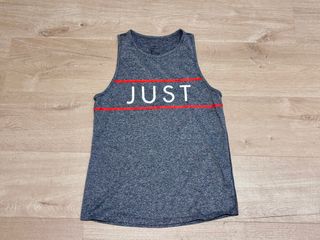 Camiseta sin mangas de Nike en color gris jaspeado. Presenta un diseño con dos líneas horizontales rojas y la palabra JUST en blanco en el centro. - Diseño deportivo. - Tejido cómodo.