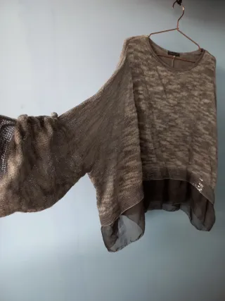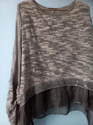 Blusón de punto con un diseño elegante y detalles brillantes. Su corte amplio y tejido ligero lo hacen muy cómodo. - Tejido de punto con hilos plateados. - Detalle de brillos en la parte inferior. - Mangas amplias y fluidas. - Capa inferior de tela semitransparente. - Top interior, sin mangas, elástico.